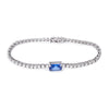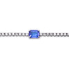 A contemporary twist on a classic tennis bracelet. An eye catching staple piece to be worn day and evening. Made of 18k gold, white diamonds and an emerald cut tanzanite.