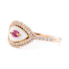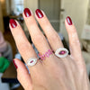 White Enamel & Ruby Evil Eye Ring is made of 18k gold, pavé cut white diamonds, white enamel and a ruby. A quirky, girly take on the traditional evil eye. This is a great piece to buy as a gift!