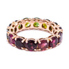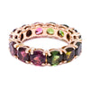 Our favourite colour combination; green and pink! Half of this eternity style ring is set with berry pink and the other half with dark green, round tourmalines.