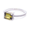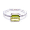 Green Tourmaline Pinky Ring is an eternity ring adjourned in pave cut white diamonds and a rectangular, green Tourmaline gemstone.
