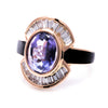 A beautiful, intricately designed, Art Deco style ring featuring a tanzanite and baguette cut white diamonds. The ring is set in 18k gold and the band is covered in black enamel. We like to pair it with our Emerald & Diamond Art Deco Ring!